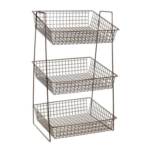 Basket Display Stand, 3-tier, 16" x 13-1/2" x 27"H, rectangular, slanted top baskets/flat bottom basket, powder-coated metal wire, espresso finish