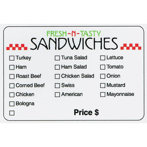 Food Packaging Label, "Fresh-N-Tasty Sandwiches", 3" x 2", rectangular, check-off boxes, paper, red/green/black imprinted, white background (500 each per roll)