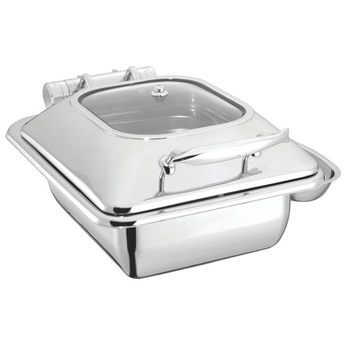 Induction Chafer, 1/2-size, 4-1/4 qt., 18" x 12-3/5" x 8-1/4"H, rectangular, with food pan, water pan, spoon holder, & hydraulic self-closing cover with glass window, water return system, food pan lifting pin, stainless steel, mirror finish