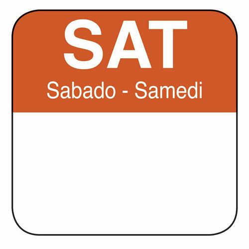 Day Of The Week Label, "Saturday", 1" x 1", square, write-in, removable, tri-lingual (English/Spanish/French), temperature range: -40° to 180°F, paper, orange (1000 each per roll)