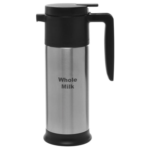 Decanter, "Whole Milk" imprinted, 1 liter, 6" x 4-1/2" x 11-1/2"H, with base, vacuum insulated, retention: 2-3 hours, push-button, black lid, stainless steel, brushed finish