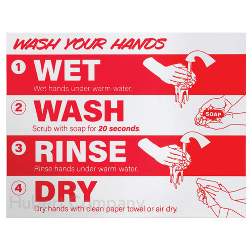 Handwashing Decal, "wash your hands" with step by step, 11"L x 8-1/2"W, rectangular, removable adhesive, vinyl, red/white
