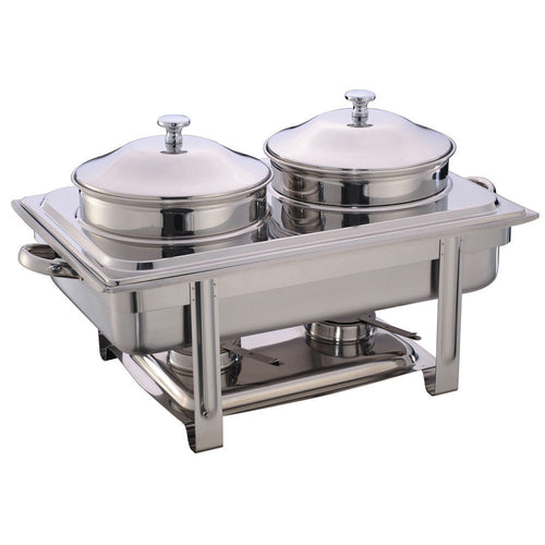 Soup Station Chafer, full-size, 2-2/5" x 13-4/5" x 14"H, with (2) 4-4/5 qt. round containers, water pan, (2) lift-off covers, (2) fuel cell holders, frame, adapter plate & stainless steel