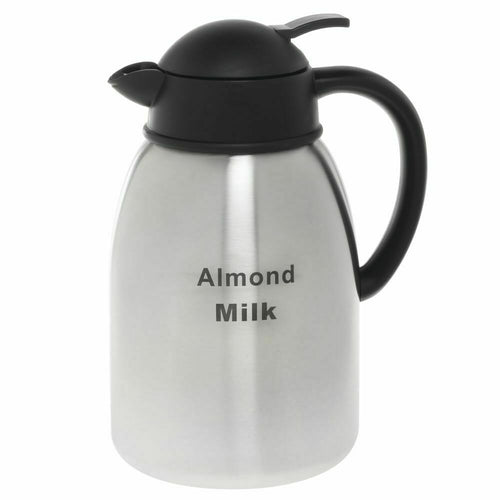 Decanter, 1-7/8 liter, 5-1/2" dia. x 10"H, etched: "Almond Milk", double-wall, retention: 4-6 hours (hot) or 2-3 hours (cold), black screw on push button lid, stainless steel, brushed finish