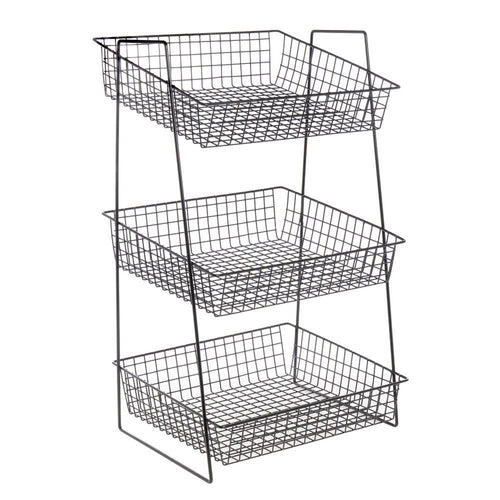 Basket Display Stand, 3-tier, 16" x 13-1/2" x 27"H, rectangular, slanted top baskets/flat bottom basket, powder-coated metal wire, black