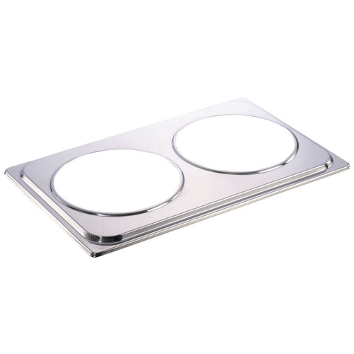 Adapter Plate, 2-compartment, 20-7/8" x 13-2/8" x 3/4"H, rectangular, holds (2) round containers, stainless steel