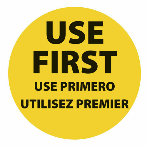 Label, "Use First", 2" dia., round, removable, tri-lingual (English/Spanish/French), paper, black imprinted, yellow (500 each per roll)