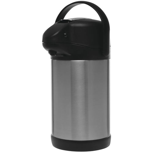 Airpot, 2-1/2 liter, 8-3/4" x 6-1/4" x 13"H, retention: up to 5 hours, stainless steel lined, lever style, black lid, swivel base, recessed pump, stainless steel