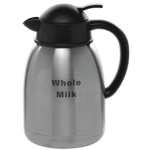 Decanter, "Whole Milk" imprinted, 1-1/2 liter, 7" x 5-1/2" x 10"H, double-wall, retention: 2-3 hours, push-button, black lid, stainless steel, brushed finish