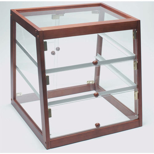 Bakery Display Case, full or self-service, 20" x 18" x 20"H, rectangular, countertop, slanted, shelf runners to hold (3) 13" x 18" trays, (2) front lift-up doors, (2) rear doors with magnetic catch, clear tempered glass with brass corners, bamboo wood trim with mahogany finish