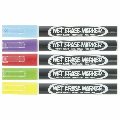 Wet Erase Marker Set, 5-piece, fine point, non-toxic ink, safe for use on non-porous surfaces, includes (1) each colors: light green, blue, bright yellow, bright red and bright purple