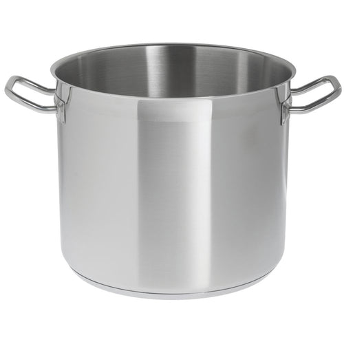 Stock Pot, 26-1/2 qt., 12-3/5" dia. x 12-3/5"H, without lid, induction ready, electric/gas/ceramic/halogen top safe, welded stay-cool hollow handles, encapsulated base, 304 stainless steel, matte finish, NSF