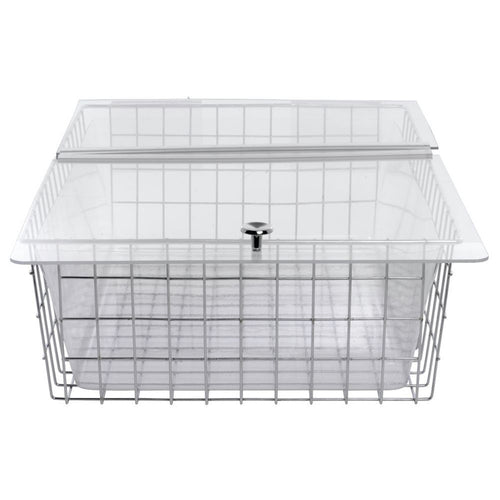 Euro Display Basket Set, 14-5/16" x 20-1/4" x 6-1/8"H, rectangular, clear acrylic hinged cover with knob & liner, metal wire basket, chrome finish