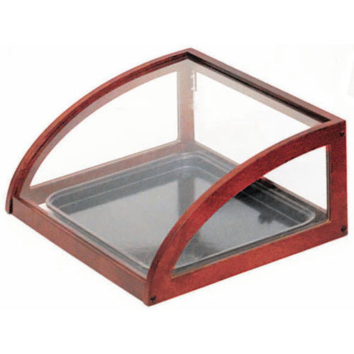 Bakery Display Case, full-service, 20" x 15" x 8"H, rectangular, countertop, curved, holds (1) 13" x 18" tray, single rear door, bottomless design, clear tempered glass with brass corners, bamboo wood trim with mahogany finish