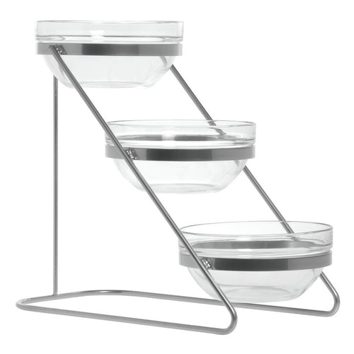Bowl Display Stand, 3-tier, 9" x 17-1/2" x 14"H overall, rectangular, (3) 8" dia. x 3-1/2"H clear glass bowls, silver powder-coated metal stand