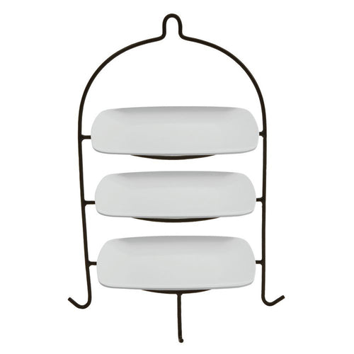 Platter Stand Set, 3-tier, 14-1/2" x 11" x 19-1/2"H overall, rectangular, (3) white melamine platters, black wrought iron stand