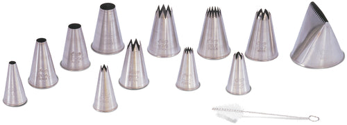 Ateco Pastry Tube Tips, various sizes, assorted shapes, seamless, includes (1) cleaning brush, (1) plastic storage box, and (12) tips stainless steel