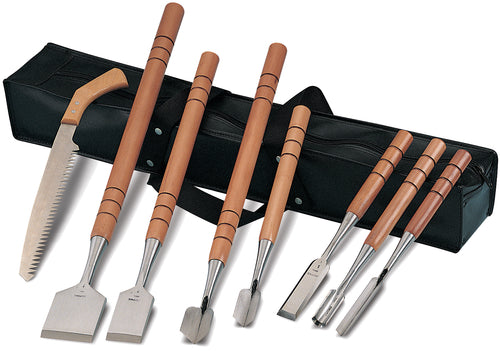 Artisan Ice Carving Set, (1) saw, (7) chisels, includes vinyl bag, stainless steel blades, wood handles (set of 8 pieces)