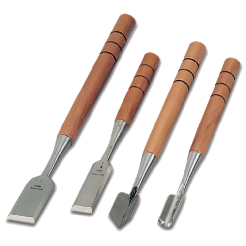 Executive Ice Carving Set, includes: (2) straight chisels, (1) gouge chisel, and (1) V-shaped chisel, stainless steel blades, wood handles (set of 4 pieces)