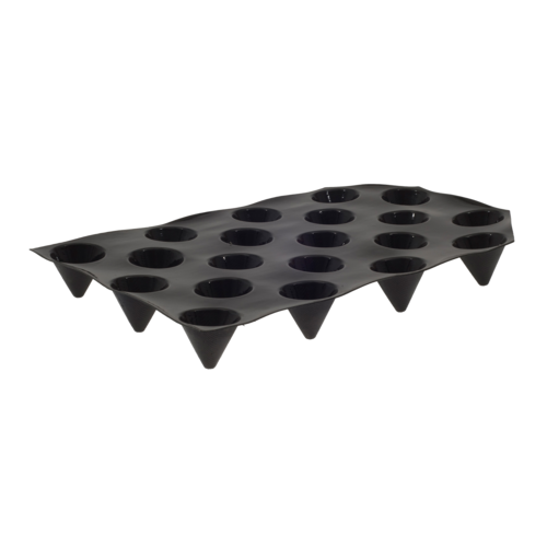 Demarle Flexipan® Mold, 23"L x 15"W, (20) cone, 2-3/4" dia. x 2-3/8"H with 2-7/10 oz. capacity each, temperature range -40° to 536°F, non-stick, flexible, silicone, black, NSF