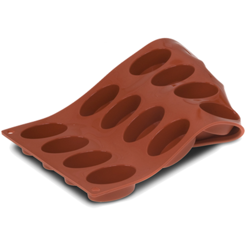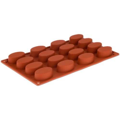 Pavoni Mold, 12"L x 7"W, (16) oval, 2"L x 3/4"H with 3/4 oz. capacity each, temperature range -10° to +500°F, non-stick, dishwasher safe, flexible, silicone, orange