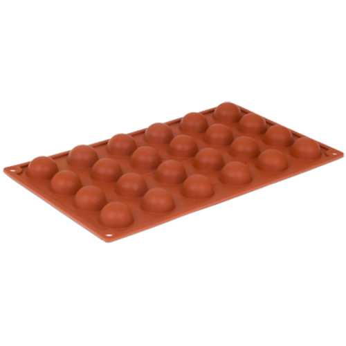 Pavoni Mold, 12"L x 7"W, (24) hemisphere, 1-3/16" dia. x 5/8"H with 3/16 oz. capacity each, temperature range -10° to +500°F, non-stick, dishwasher safe, flexible, silicone, orange