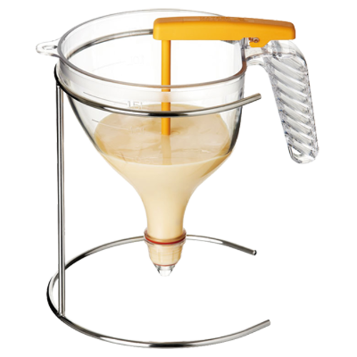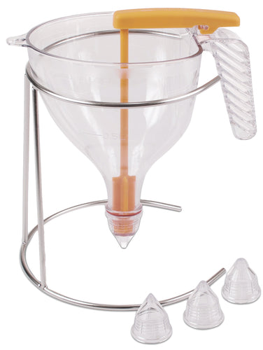 Automatic Funnel, 50 oz., (1-1/2 liters) capacity, 8-1/4" dia. overall, portion control (1/8" dia. opening), dishwasher safe, includes (1) wire stand and (4) nozzles 1/13" 1/6" 3/13" and 4/13" dia., ergonomic handle, watertight joint, polycarbonate, transparent