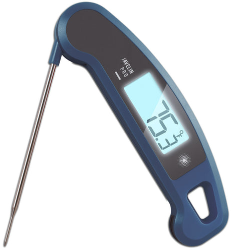 Lavatools Javelin Thermometer, temperature range -40°F to 482°F (-40°C to 250°C), folding, stainless steel probe, antimicrobial exterior, sleep mode, intelligent stabilization, touch sensor, anit-fog display, power saver, splash resistant, magnetic back, plastic, indigo, NSF