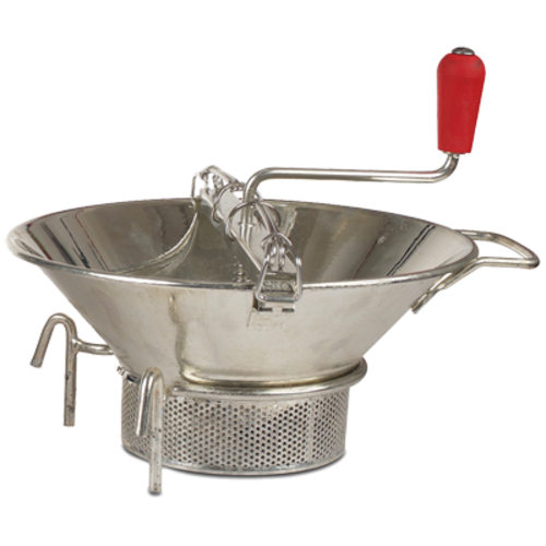 French Food Mill, 8 qt., 14" dia., includes (1) sieve with 3.0mm holes, double pulping area, processes 10 lbs. per minute, tinned steel