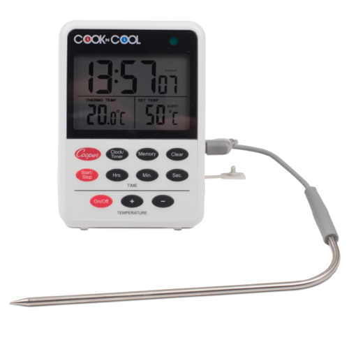 Cooper Electronic Thermometer, timer and clock, 4"H x 2-1/2"W, digital, 3 foot stainless steel wire and probe, temperature range 32 to 392°F, magnetic back, batteries included, plastic and stainless steel, black