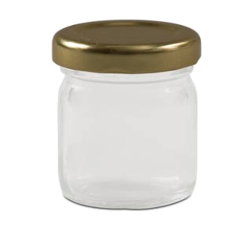 Mini Glass Jar, 1.3 oz., with gold plastic screw top cap, glass, transparent