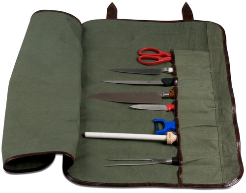 Boldric Knife Bag, 7-1/2"L x 18"D opened, (9) pockets hold up to 15" tools, leather handle and straps, brass buckles, canvas, green