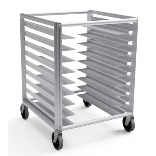 Pan Rack, open sides, (9) pair removable universal slides with 3" center spacing (adjustable on 1-1/2" center), multi-purpose, bolted angle aluminum frame, knock down, end loading, 5" stem casters, ETL