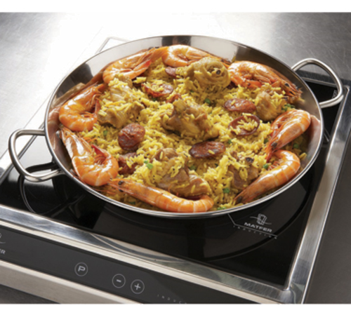 Paella Pan, 11" dia. x 1-1/2"H, sandwich bottom-stainless steel, aluminum, stainless steel, 2 handles, suitable on gas, electric, ceramic, halogen, and induction hobs