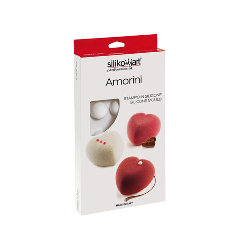 Silikomart® 3D Mold, "Amorini", 11-3/4"L x 7"W, makes (8) 2-1/2"L x 2-1/2"W x 1-1/2"H heart shapes, flexible, non-stick, silicone, white, Made in Italy