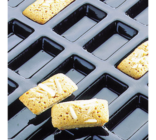 Flexipan® Financiers Mold, 24 per sheet, 2 oz. cap., 3-1/2"L x 1-7/8"W x 1/2"H, sheet size: 23-3/4"L x 15-3/4"W, non-stick, withstands temperatures from -40°F to +580°F, flexible, reusable 2,000 to 3,000 times, food grade silicone, NSF, made in France