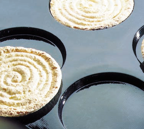 Flexipan® Discs Mold, xx-large, 6 per sheet, 10-1/6 oz. cap., 7-1/3" dia. x 1/2"H, sheet size: 23-3/4"L x 15-3/4"W, non-stick, withstands temperatures from -40°F to +580°F, flexible, reusable 2,000 to 3,000 times, food grade silicone, NSF, made in France