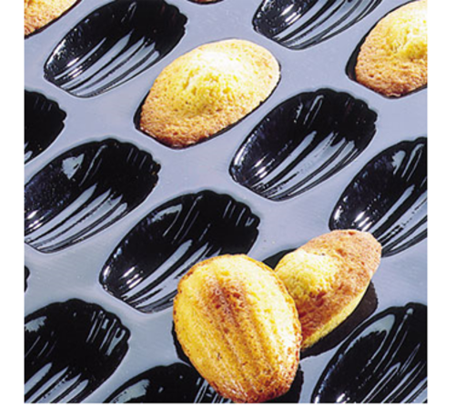 Flexipan® Mini Madeleines Mold, 56 per sheet, 1/2 oz. cap., 2" dia. x 1-1/2"H, sheet size: 23-3/4"L x 15-3/4"W, non-stick, withstands temperatures from -40°F to +580°F, flexible, reusable 2,000 to 3,000 times, food grade silicone, NSF, made in France