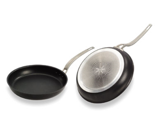 Fry Pan, 11" dia., 5 mm thick aluminum body, 4-layer non stick coating with scratch resistant undercoat, stainless steel with aluminum diffuser bottom, coated rivets, cast stainless steel ' cool touch' handle with thumb grip, suitable for gas, electric, ceramic, halogen, and induction hobs