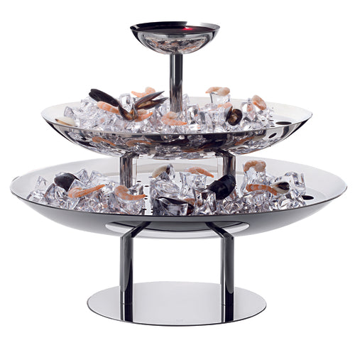 Seafood Display Stand, 3-tier, 1-3/4 gallon, includes: (1) 18-1/8" x 12-1/4" oval & (1) 14-1/2" x 9-7/8" oval & (1) 4-3/4" dia. round bowls, with grills, 14-1/2" overall height, dishwasher safe, 18/10 stainless steel, Plateau Royal