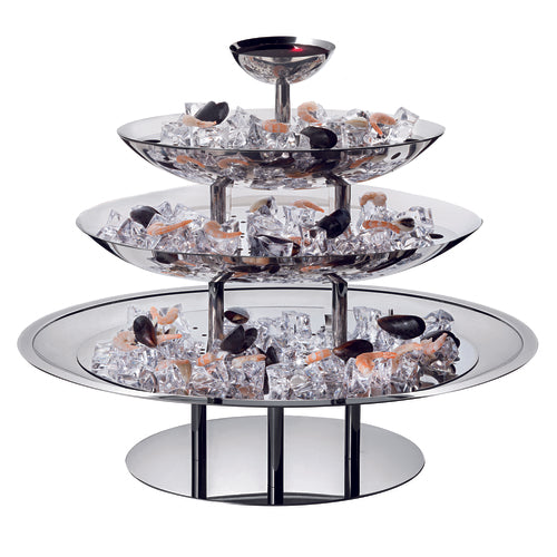 Seafood Display Stand, 4-tier, 2 gallon, includes: (1) 21-5/8" x 9-1/2" oval, (1) 18-1/8" x 12-1/4" oval & (1) 14-1/2" x 9-7/8" oval & (1) 4-3/4" dia. round bowls, with grills, 19-1/3" overall height, dishwasher safe, 18/10 stainless steel, Plateau Royal