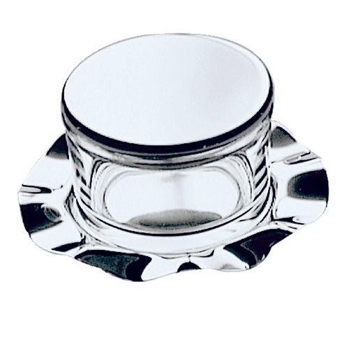 Parmesan Cheese Basin, 6-3/4 oz., 3-1/2" dia. container, 5-7/8" dia. x 2-3/4"H overall, round, with lid & base tray, dishwasher safe, glass & 18/10 stainless steel, Sole