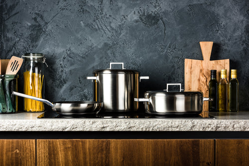Pot, 14-4/5 qt. (14 liter), 11" dia., round, deep, heat-diffusing bottom with elevated thickness, ergonomic, hollow, welded, heat-resistant handles, dishwasher safe, induction/gas/electric/halogen/oven safe, 18/10 stainless steel, external matte finish, glossy-matte handle finish, STILE by Pininfarina