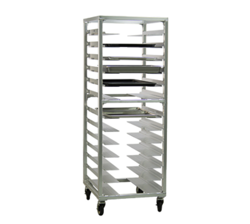 Universal Pan Rack, mobile, 24-1/2"W x 26"D x 71-1/8"H, 13-stepped-angle runners, 4-1/2" spacing, accommodates 12" x 20" to 18" x 26" pans, welded aluminum construction, end loading, 5" swivel platform casters, NSF, Made in USA