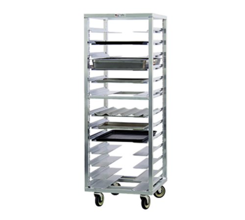 Pan Rack, mobile, (13) universal adjustable aluminum guides, bottom pan slides are welded in place, 4 1/2" OC for 12 x 20 to 18 x 26 pans, 1-1/2" centers, end loading, 5" platform swivel casters, NSF, Made in USA