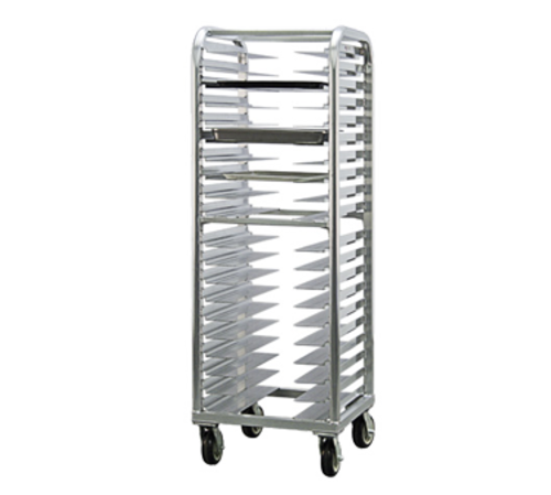 Lifetime Series Bun Pan Rack, heavy duty, aluminum, 73"H, (20) universal stepped-angle runners are 2" x 6-3/16" x .100 with 3" spacing (non-adjustable), extruded aluminum guides for 12 x 20 or 18 x 26 pans, fully welded 1-1/2"x1-3/4" x .07" smooth wall D-tube uprights, end loading, (4) 6" x 2" platform swivel casters, NSF, Made in USA