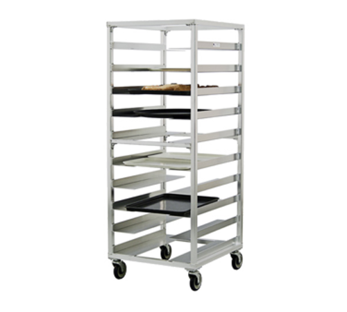 Universal Tray Rack, mobile, full height, open sides, accepts oval tray sizes 18" x 26", 12" x 20", 22-3/4" x 27-5/8", 20-3/4" x 25-1/2" & 23-1/2" x 29", (10) tray capacity, 6" centers, all-welded aluminum construction, 5" platform swivel casters, NSF, Made in USA