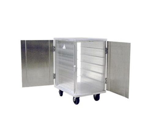 Room Service Cart, pass-thru, aluminum reinforced doors, holds (12) 15" x 20" trays, (5) pair angle runners, 5-1/2" spacing, heavy duty base, aluminum construction, (4) 6" plate swivel casters, Made in USA