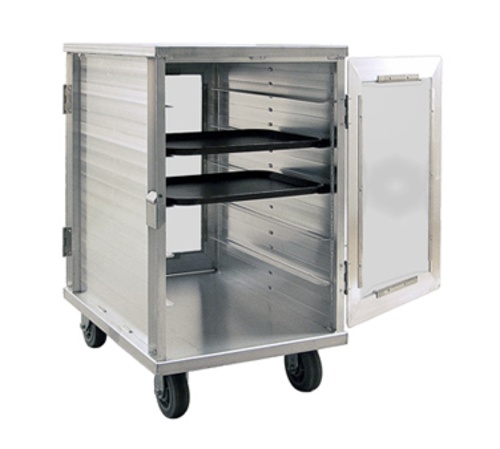 Room Service Cart, pass-thru, polycarbonate reinforced doors, holds (12) 15" x 20" trays, (5) pair angle runners, 5-1/2" spacing, heavy duty base, aluminum construction, (4) 6" plate swivel casters, Made in USA