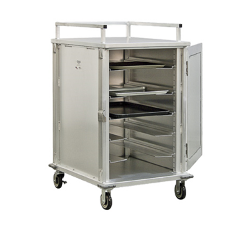 Universal Room Service Cart, holds (12) 14" x 18" or (12) 15" x 20" or (6) 16" x 22" or (6) 18" x 26", (5) pair angle runners, adjustable on 1-1/2" centers, door opens 270°, heavy duty base, corner bumpers, welded top rail, aluminum construction, (4) 5" plate casters (2 swivel with brakes & 2 rigid), Made in USA